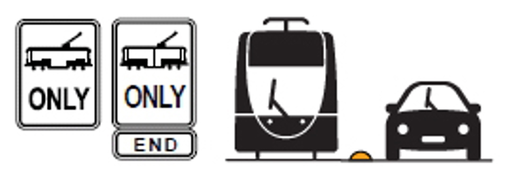 Tramways are divided from traffic by raised dividing strips or double yellow lines beside the tram tracks. Overhead signs indicate their use by trams only. You must not drive in a tramway, but you may use gaps in the dividing strips to cross tram tracks when safe to do so.
