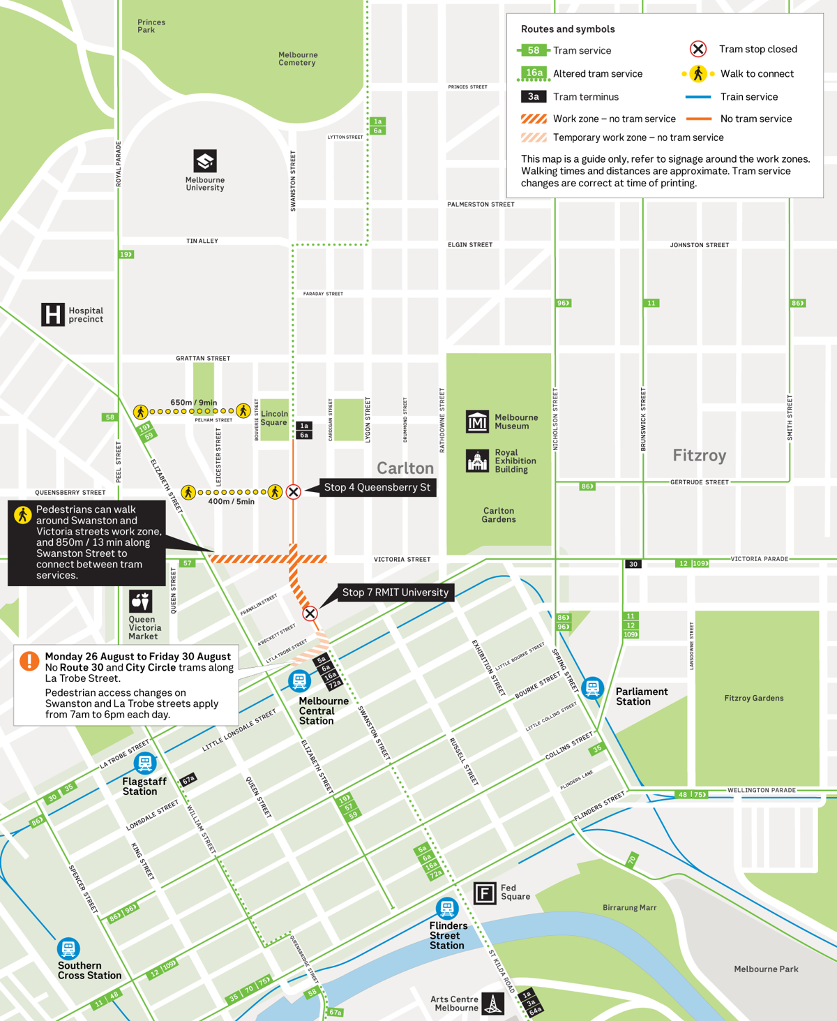 Stop 3 Lincoln Square and Stop 8 Melbourne Central Station to connect between tram services.